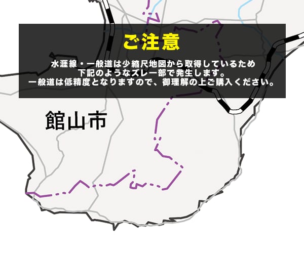 ※一般道路は少縮尺の地球地図日本を基図としているため低精度となります。説明図のように海岸線と合わない箇所も発生します。ご了承の上ご購入ください。